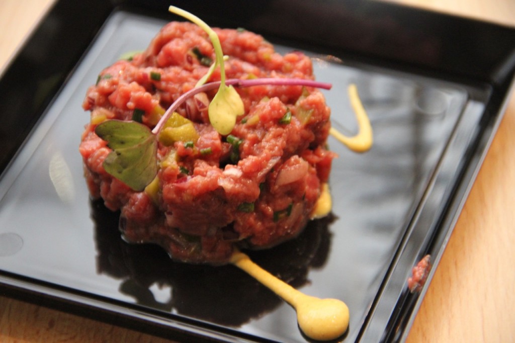 La propuesta de este chef que practica una cocina de mercado y producto selecto fue un “Steack Tartar de Ternera macerado con encurtidos y emulsión de Aceite de Oliva”.